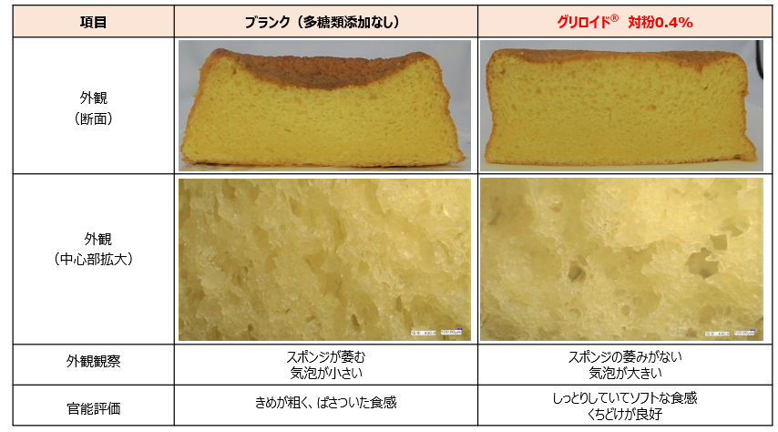 一つの例としてスポンジケーキへグリロイドを使用したときの試験結果をご紹介します。