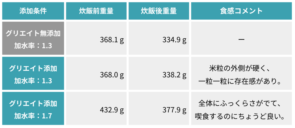 グリエイトは米に対して0.5%添加。加水量を増やした際の添加効果(米:160g)